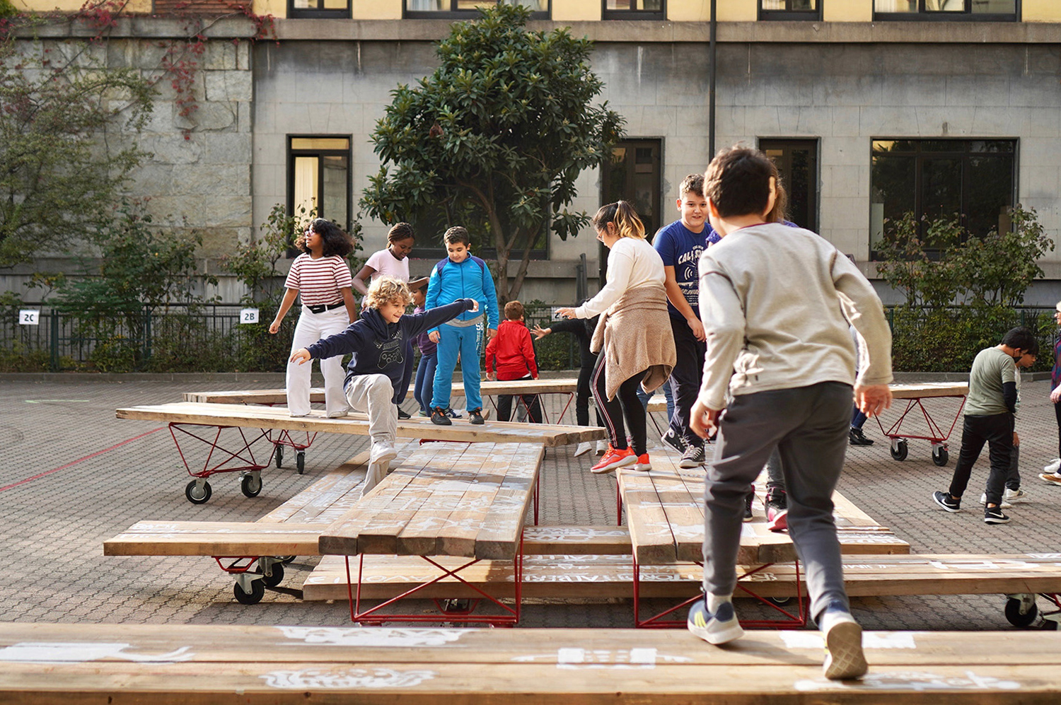 SHARED PLAYSCAPES is a co-designed system of mobile urban elements to promote collective play in public spaces. Involving primary school students, the research team, and the municipalities concerned, the project proposes temporary interventions in pacified spaces adjacent to primary schools in Barcelona and Milan. Its aim is double. On the one hand, it promotes the activation of public spaces contributing to the concept of playable cities through the lens of temporality. On the other hand, it constructs a meaningful relationship between children from different cities using design protocols based on sharing and collaborating at a distance. SHARED PLAYSCAPES explores the values of co-design at both the material level (informing design decisions for a temporary, adaptable and reconfigurable public space) and the relational level (establishing an operative, narrative and experiential link between participants).